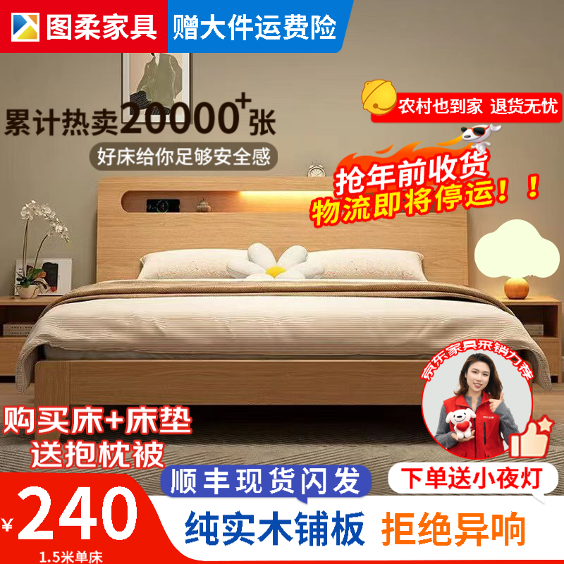 百亿补贴图柔【顺丰闪发】床实木床现代简约双人床主卧大床单人床出租床 单床【促销款】 1.5*2米 框架结构