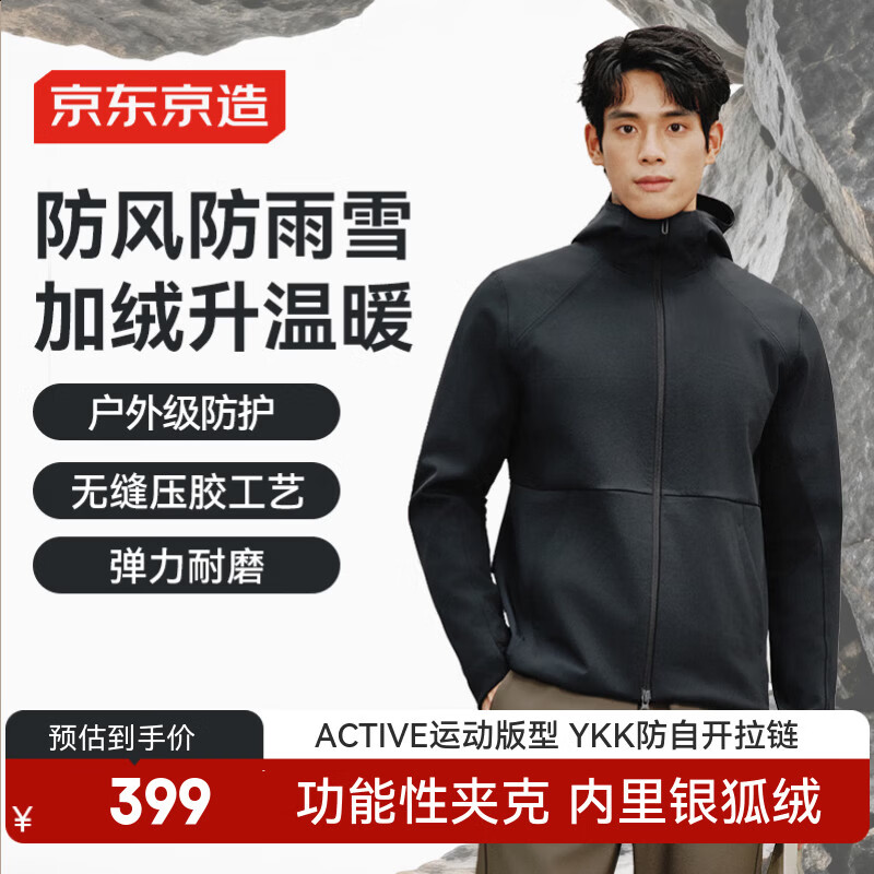 自营京东京造加绒防风防泼水运动夹克男户外软壳外套跑步保暖上衣 黑色L