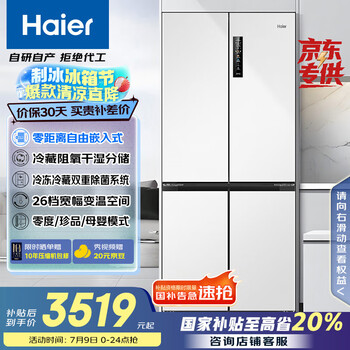 自营海尔(Haier)500L零距离自由嵌入式十字对开四门电冰箱无霜超薄保鲜一级能效BCD-500WGHTD49W9U1国家补贴20%