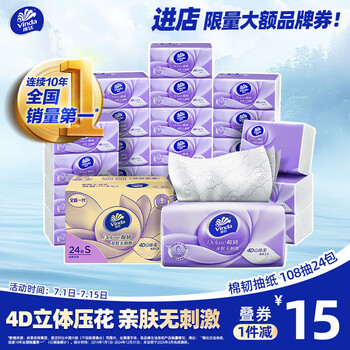 自营维达(Vinda)抽纸 棉韧3层108抽*24包S码 亲肤无刺激 卫生纸 纸巾 餐巾纸 整箱