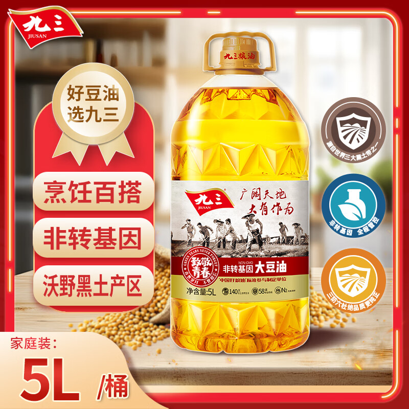 自营九三 食用油 非转基因 致青春系列 一级5L大豆油(九三出品甄选好油)