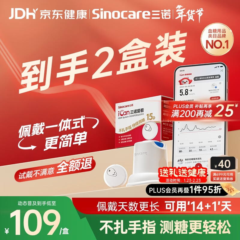 自营三诺爱看动态血糖仪手指免扎针家用15天持续血糖监测仪i3经典款2盒