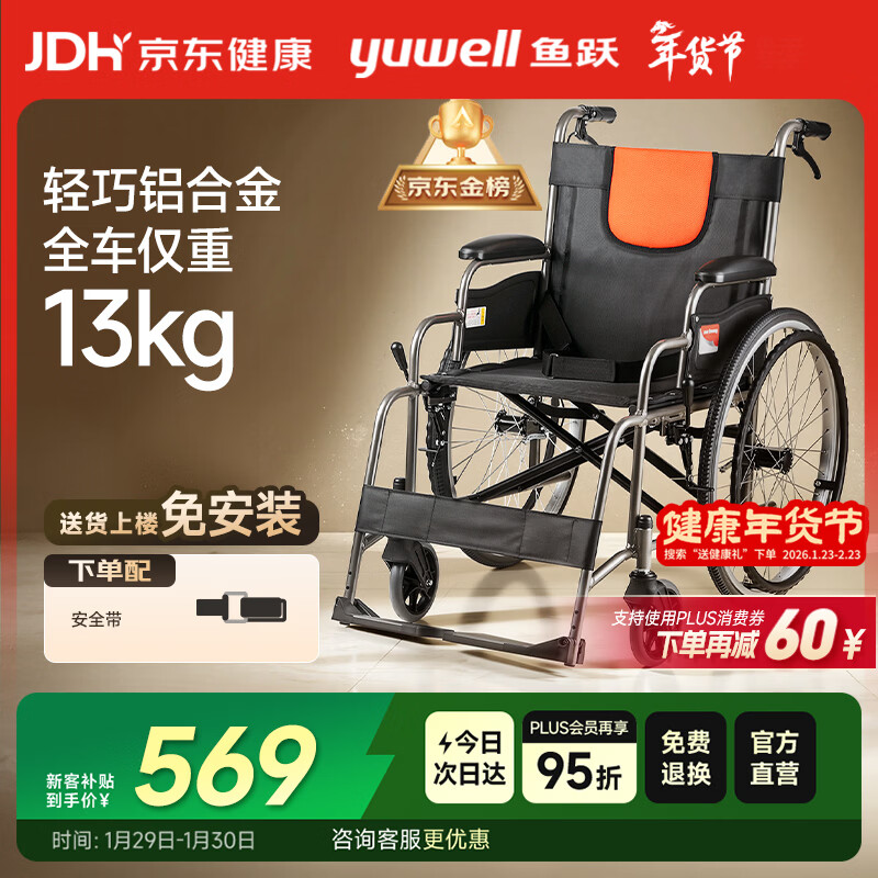 自营鱼跃 (yuwell)手动轮椅车H062折叠老人轻便免充气铝合金旅行手推代步