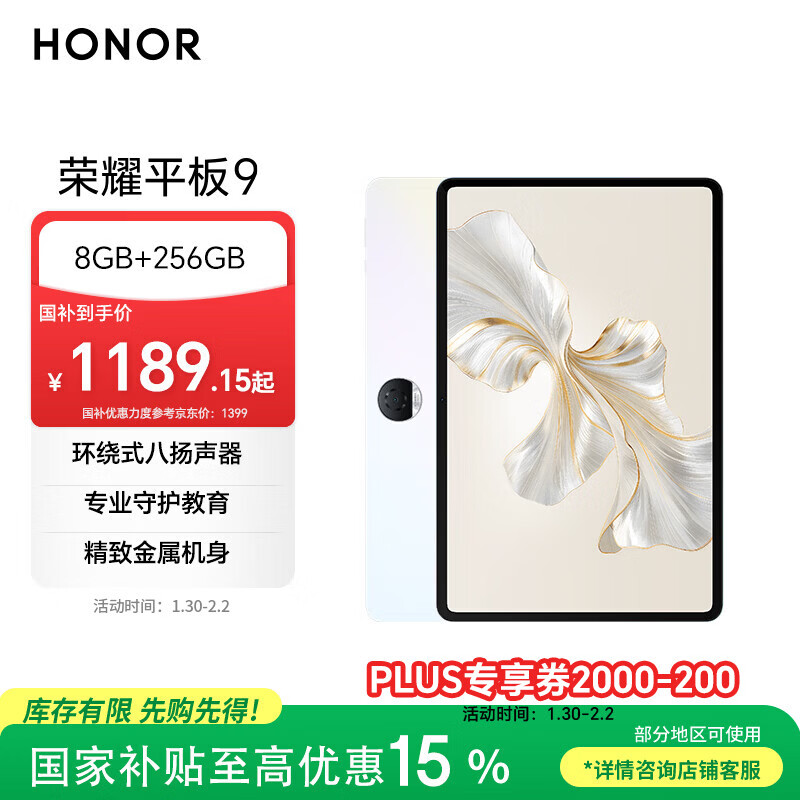自营荣耀平板9标准版 【国家补贴】12.1英寸平板电脑 8+256GB 2.5K护眼全面屏 专业教育守护 沐光白