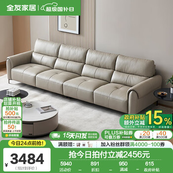旗舰店全友(QUANU)家居现代简约真皮沙发家用客厅头层牛皮四人位直排式沙发 【米灰|牛皮】3.24米直排沙发