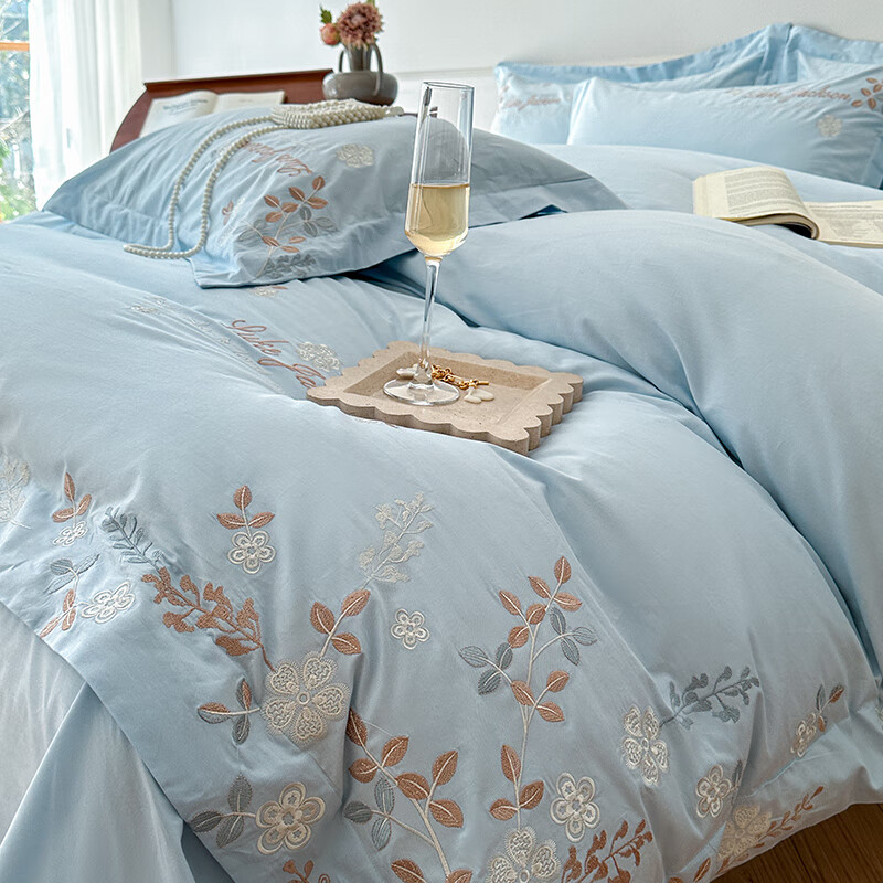 Erwin RommelA类长绒棉贡缎50支重工盘金苏绣四件套 全棉刺绣活性床品套件 繁花-浅蓝-JN 床单款1.5米床(被套200*230cm)